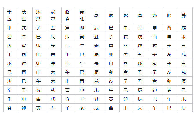表中地支可看出吉凶的时间和方位。如甲帝旺在卯,卯指卯年、卯月、卯日、卯时,方位是东方,这里的东方指自己出生地的东方。又如,甲木墓库在未,墓为入墓,不吉,而未,指未年、未月、未日、未时,方位在西南方。预知了这些信息,我们就可以做到,有利的事,在有利的时间里到有利的方位去办,不利的事,在不利的时间里不办,且不去不利的方向,这样就可以避免一些意外之灾。因此,十天干生旺死绝表是一个趋吉避凶的信息标志和时间表。表中地支生旺死绝的查法和天干五行对应:寅对甲,卯对乙,辰戍对戊土,丑未对己土,巳火对丁火,午火对丙火,申金对庚金,酉金对辛金,子水对壬水,亥水对癸水。