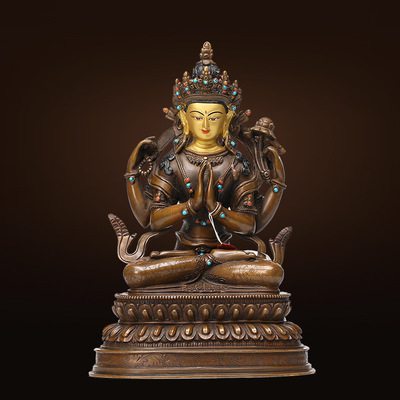 藏传佛教“三怙主”中的观音像为四臂观音像。四臂观音,藏语称“奇木格”,在藏传佛教寺院壁画、雕塑中常见的四臂观音有两种相状:寂静像和忿怒像。